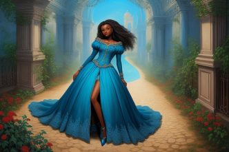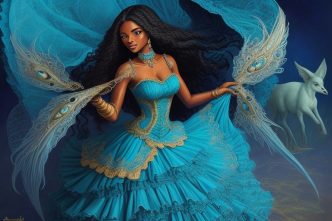Surreal Mahogany princess wearing blue and green with large flowers nestled in her afro 2