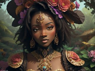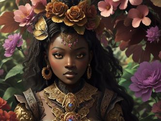 Surreal Mahogany princess wearing blue and green with large flowers nestled in her afro 1